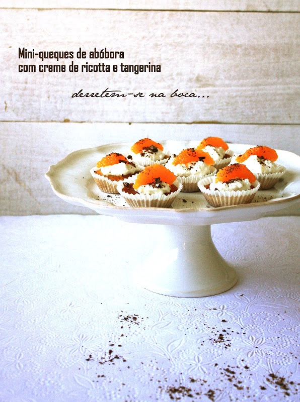 Este ano decidi esgotar todas as possiblidades gustativas que uma certa bolina pode oferecer. Já deu em massa, em caçarola, em folhados e agora deu em queques, mini-queques para ser mais exacta, húmidos, macios, cobertos de creme de ricotta e tangerina, enfim, a soma de 3 dos meus sabores preferidos. E ficam lindos com os gomos cor-de-laranja (podem ler aqui como se cortam os gomos sem película) por cima do creme branco e cobertos com pedacinhos de chocolate preto…