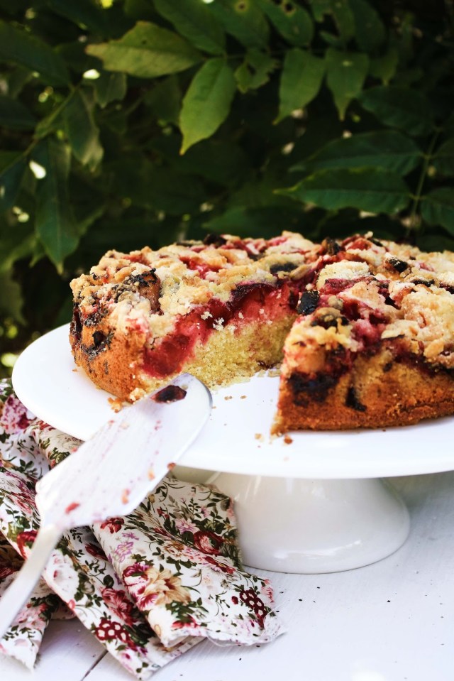 Este bolo amanteigado quase faz lembrar uma tarte de fruta. E para mim é ainda melhor no dia seguinte, depois de ficar umas horas a assimilar a manteiga da massa e do crumble e os sucos da fruta. É importante polvilhar bem a fruta com açúcar, porque a acidez das ameixas torna-se um pouco amarga, depois destas serem cozinhadas.