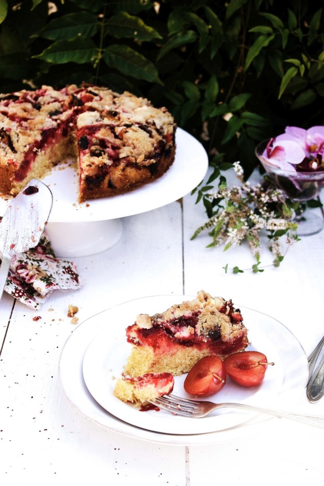 This buttery cake looks like a fruit tart and for me is even better the day after, giving it time to absorb the butter in the batter and crumble, and the plums juices. Sprinkle the plums with a generous amount of sugar, because once they are cooked, their tartness turns into a slight bitterness.