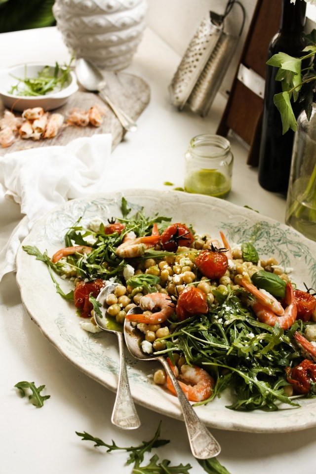 Chickpea, shrimp, arugula, roasted tomatoes and feta salad with basil vinagrette
