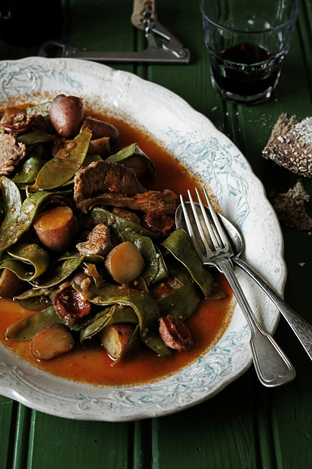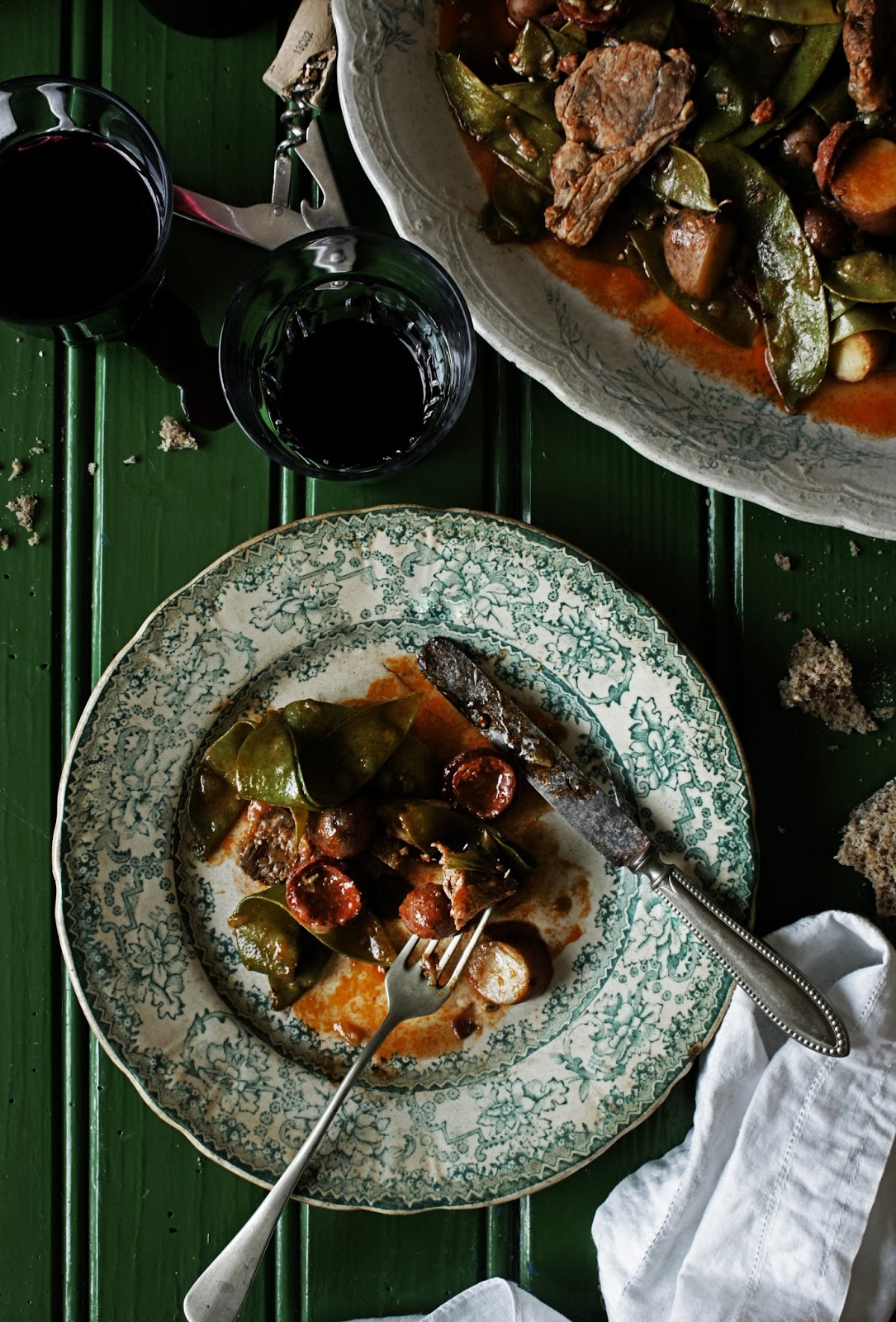 Through the pages (some of them already loose) of the “Portuguese Traditional Cooking” book, I went somewhere between Trás os Montes and Alto Douro, where they have “ervilhoto guisado” – braised peas. Ervilhoto guisado is a  pea based recipe, but the book explains that snow peas can be cooked the same way. And I, taken by the lightness with which they were exchanged for each other (the peas), I also changed the recipe a few laps. Ham became chouriço. Paprika was replaced by tomato passata. The bread was left out. And with the help of the new potatoes, that my mental plan had left out, the snow peas became an hearty, comforting meal. Just as I wanted: