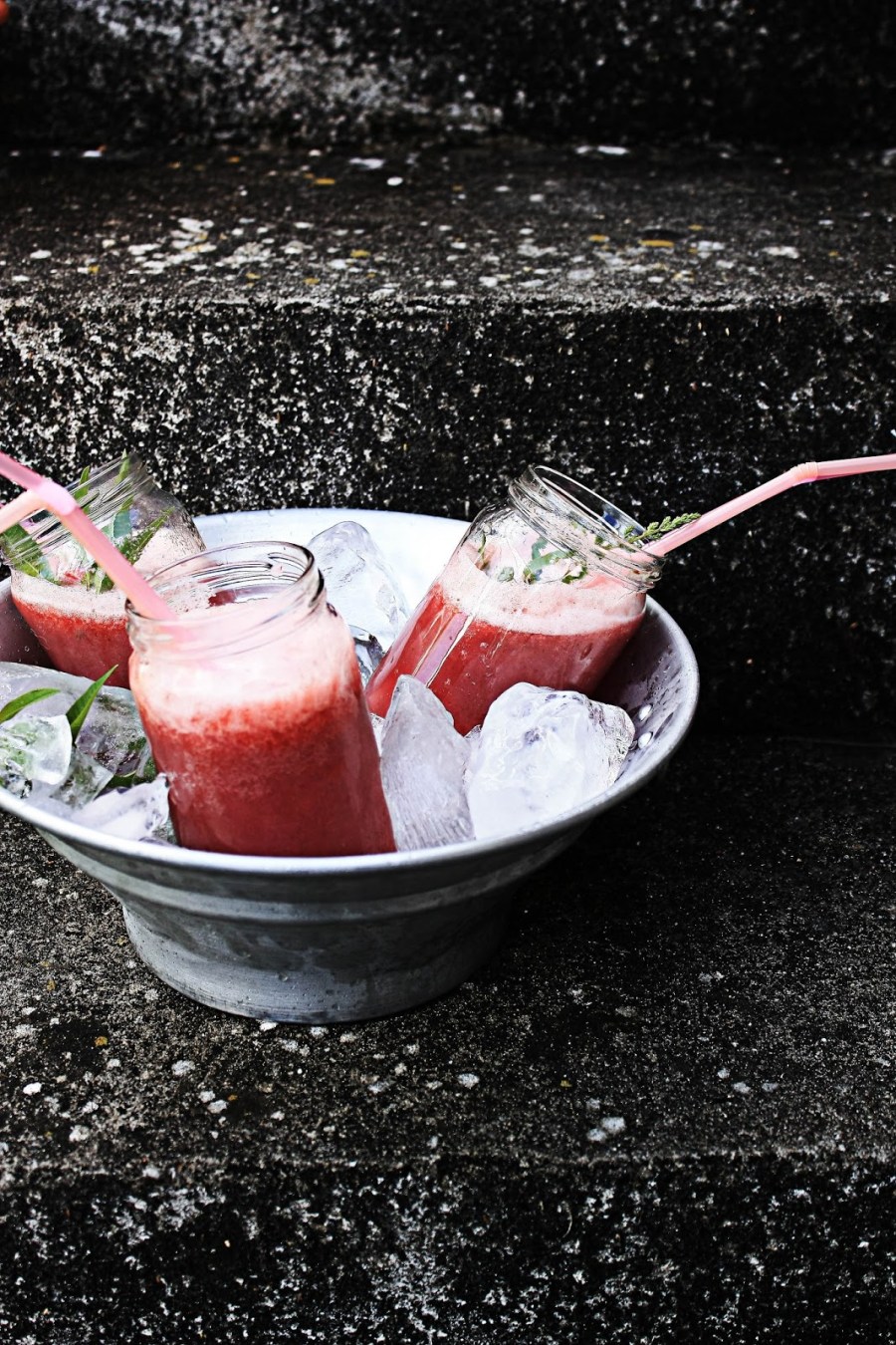 Cozinho, outros cozinham para mim. Sonho, crio, imagino. Fotografo. Mas depois vem um dia em que consigo abrandar e deixar que seja eu o objeto a ser contemplado. E quando finalmente paro, tudo o que quero é simplicidade. Assim como morangos e limonete em estado líquido, efervescente e doce. Simples. Bom. Revigorante. Apenas isso. E dou uso aos muitos frascos que fui guardando ao longo dos anos. E fico num canto da escada do jardim, enquanto os melros e pardais alimentam os seus filhotes no chão, sem me verem.