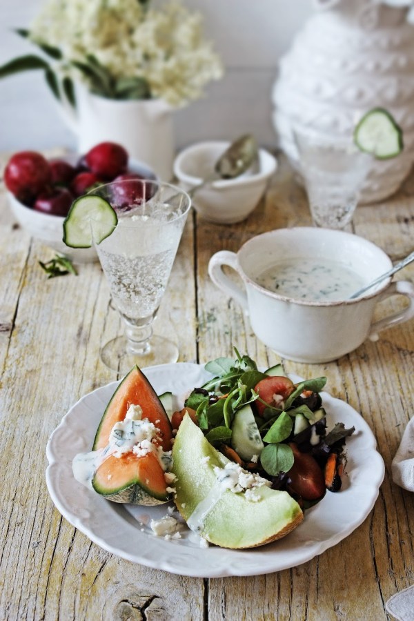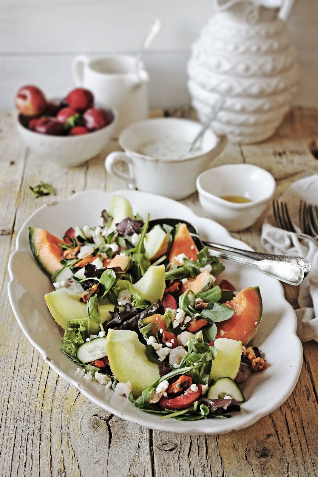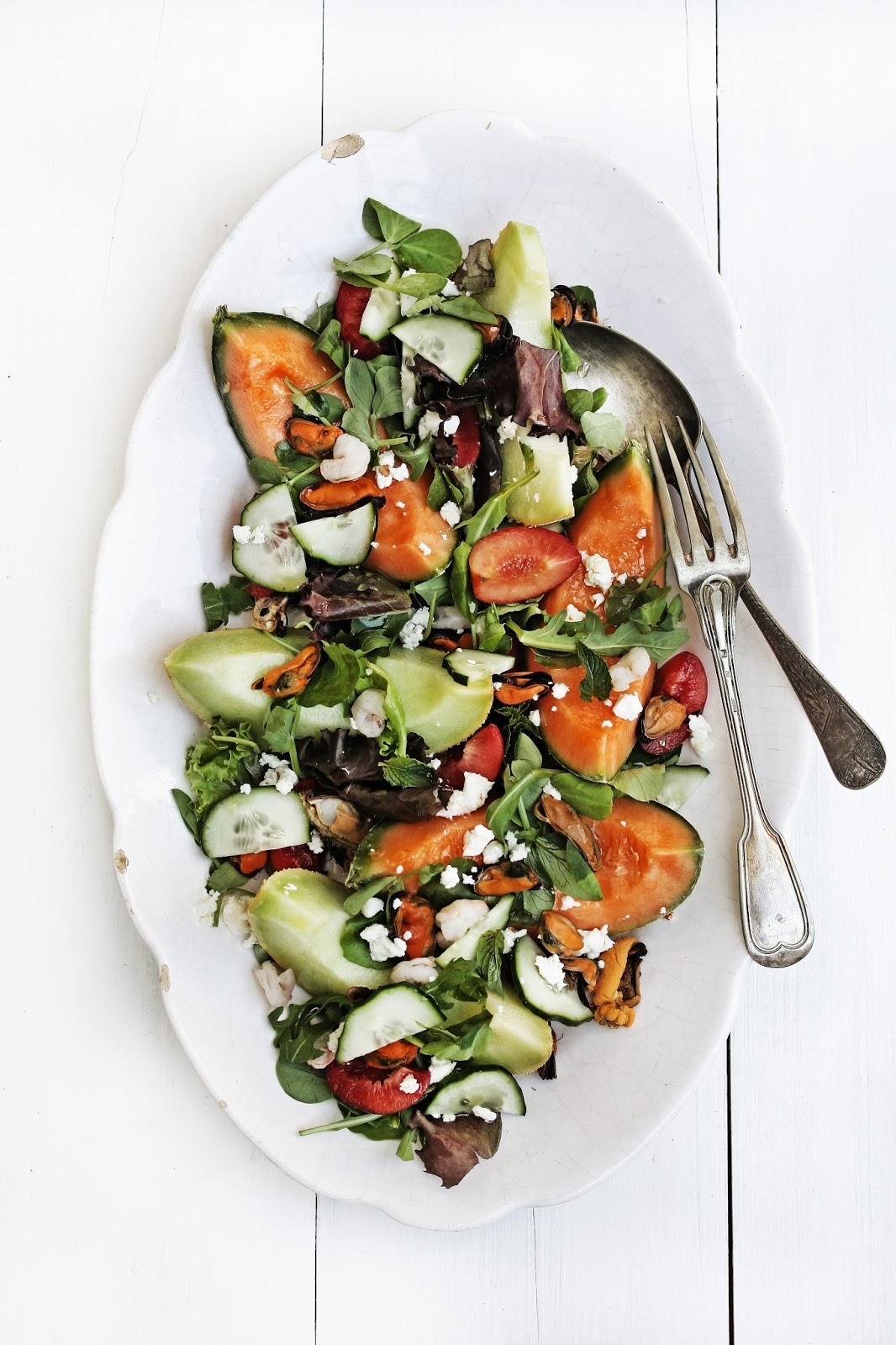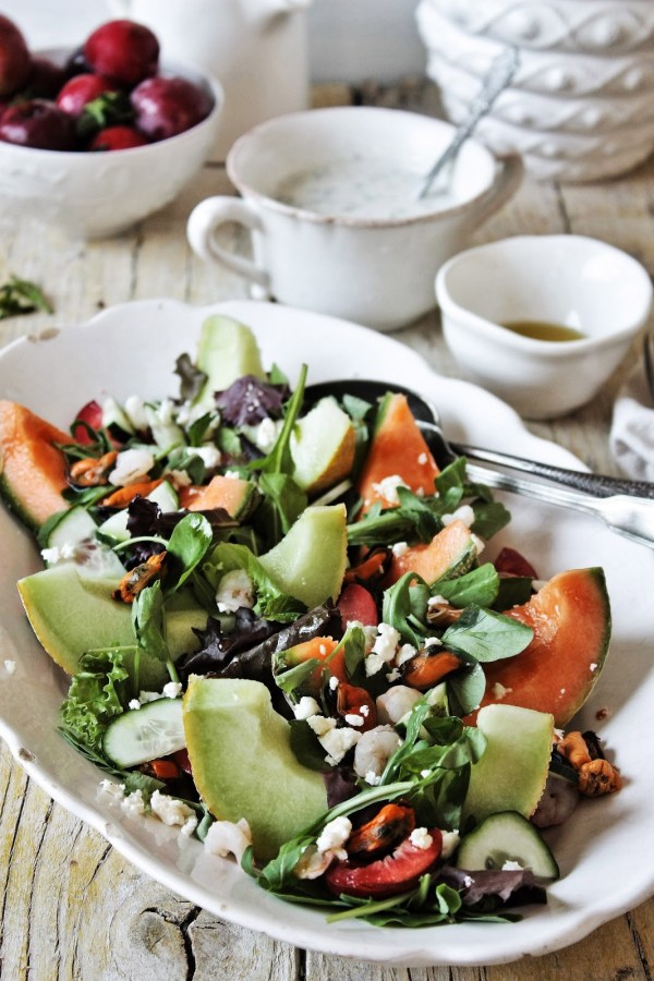 I always say that I am a person of mild Autumns and Springs. The climatic extremes never really suited me. I enter each new Summer with mixed emotions. On one hand the dull and stifling heat, that makes me want to hibernate well hidden under a fresh shadow, waiting for it to pass, just pass. But on the other hand there´s the bounty of the season that brings me some of my favorite fruits: plums, sweet, firm and juicy and fragrant melons that taste so good and remind me that Summer has a “bright side”, even for me:  picnics, bare feet on fresh grass and blue sky days spent in the countryside or at the beach. And is like so and without more that I little by little start lowering the guard and enter unhurried in a new rythm. I learn once more to live the Summer. And return to same old places. And read again this book. And watch one more time my sun and sea movies. And I make salads like this one, with fruits and leafy greens, seafood, feta cheese and lemon, mint, yogurt sauce. Mix of sweet and savory and crunchy and soft textures. Freshness, flavor and beauty, all that makes a delicious salad like this one. All that I want in a Summer salad.