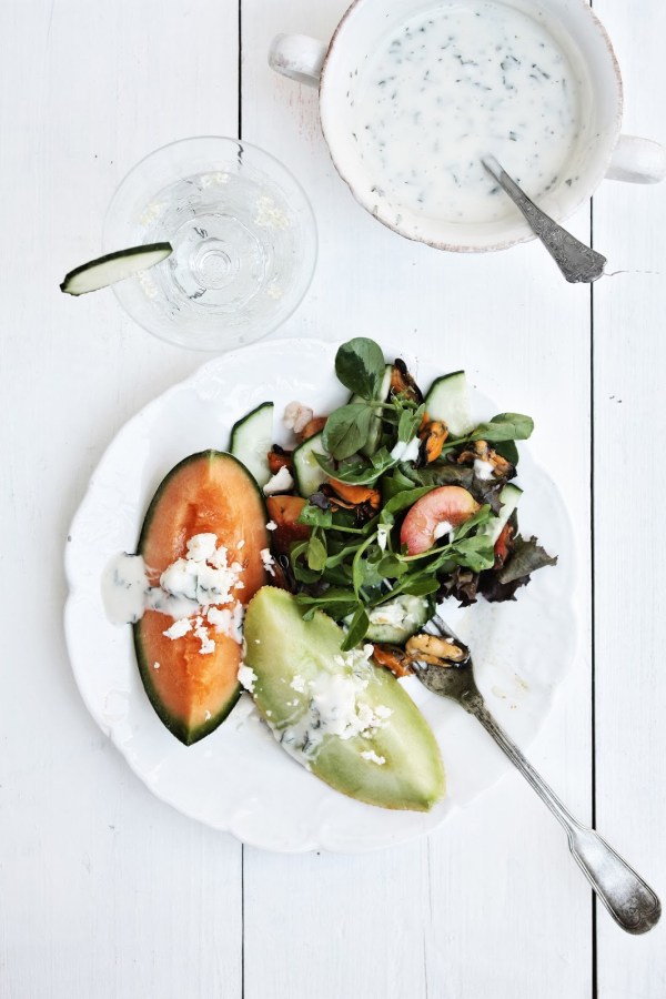 Salada de meloa com ameixas, folhas verdes, pepino, marisco e feta, com molho de iogurte, limão e hortelã