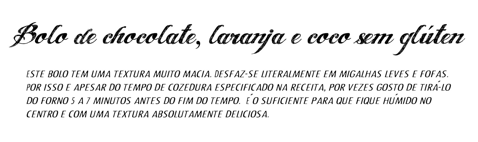 Não é que seja um hábito, muito menos uma tradição mas de vez em quando, normalmente a uma Sexta feira, surge-se-me, vindo não sei muito bem de onde, o chamamento do chocolate. Até aqui nada de novo. Mas esta coisa de responder a um “chamamento” desta natureza, para mim não é tão simples como pode parecer à primeira vista. É que aqui em casa há duas facções. De um lado estão os que defendem que os bolos de chocolate devem ser densos, secos e pesados (não faço julgamentos, afinal gostos não se discutem) e do outro estou eu, orgulhosamente só, na defesa da textura macia – húmida ou não – mas com sabor acentuado a chocolate. Por vezes resolvo a questão recorrendo a estes velhos favoritos, mas por vezes tem mesmo de ser bolo de chocolate; e sendo para mim tem mesmo de ser macio, leve; e se for húmido tanto melhor; e tem de gritar CHOCOLATE a cada dentada: Bolo de chocolate, laranja e coco, sem glúten.
