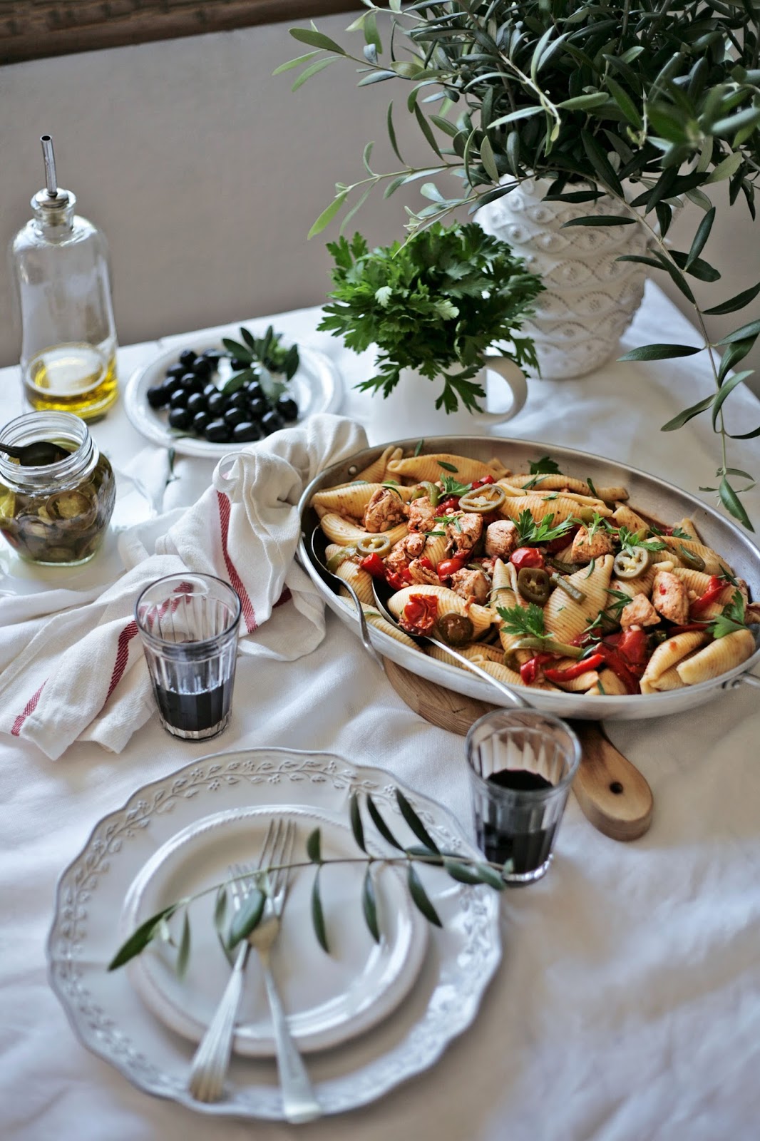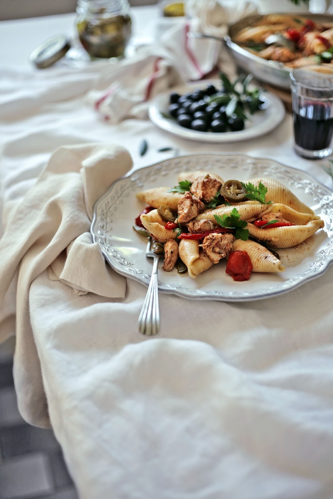 My stomach and heart have an assumed weekness for all things dough. Pasta dough, bread dough, flaky dough, especially the first since the recipe this time includes conchiglioni, these beautiful, huge shells, promisse of abundance of comforting Summer flavors. A blank canvas, a base of flavor that I painted and impregnated with the colors and scent of ripe tomatoes and green and red peppers, a touch of black olive and some savory (I told you that lately I use savory in almost everything that is cooked around here) and a few sunbeams liberating in the breeze the best of these seasonal ingredients. Without secrets or mistery this is simply a mediterranean inspired, tasty, homemade recipe without pretensions of being something else. And around here that means satisfaction guaranteed.