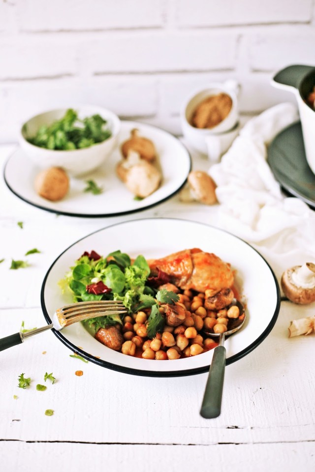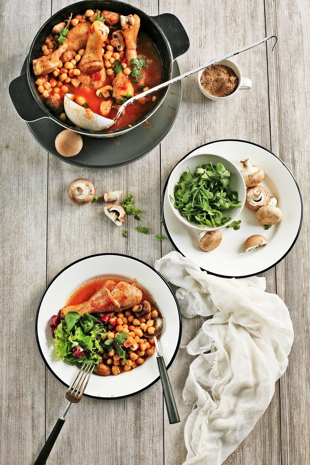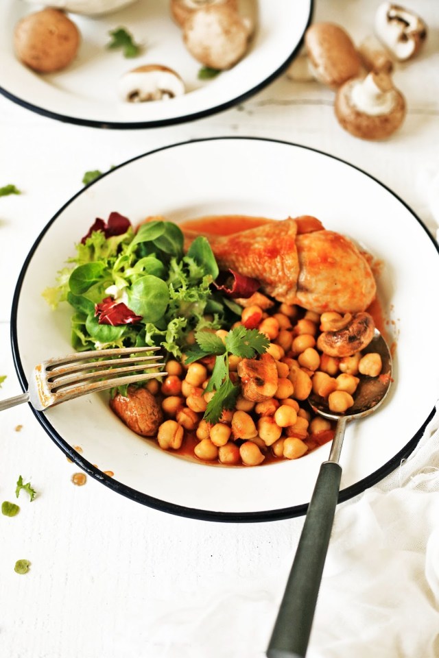 But you know what they say: Life goes on! And family meals will not wait for the planets to align for a more auspicious conjuncture, the type that foresees duck rice in the near future. So for now I will make the most of full-bodied and oversized stews, but above all easy, leaving me time to breath and to reproach myself for not having yet the courage to hire an assistent. Exactly as this one, deliciousness of chickpeas, aromatic tomato sauce, with coriander, mushrooms and chicken drumsticks.