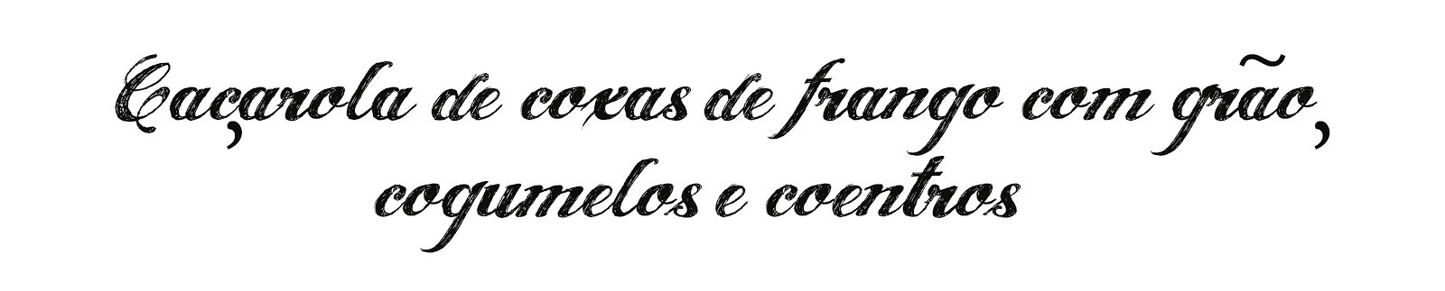 Mas sabem o que dizem: A vida continua! E as refeições em família não ficam à espera que os planetas se alinhem para uma conjuntura mais auspiciosa, assim do tipo que prevê arroz de pato num futuro imediato. Portanto, por agora desforro-me nos estufados encorpados e avantajados, mas acima de tudo fáceis, que alimentam a prole, me deixam tempo para respirar e também para me recriminar por ainda não ter tido coragem para contratar uma assistente. Tal qual como este, delícia de grão, de molho espesso e aromático de tomate, com coentros, cogumelos e coxas de galinha.