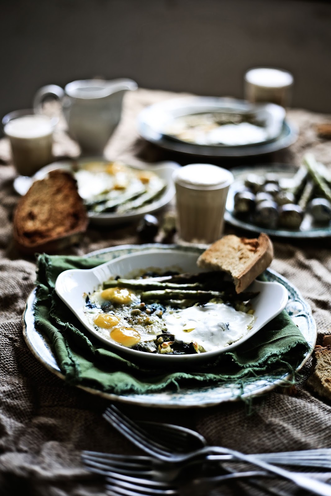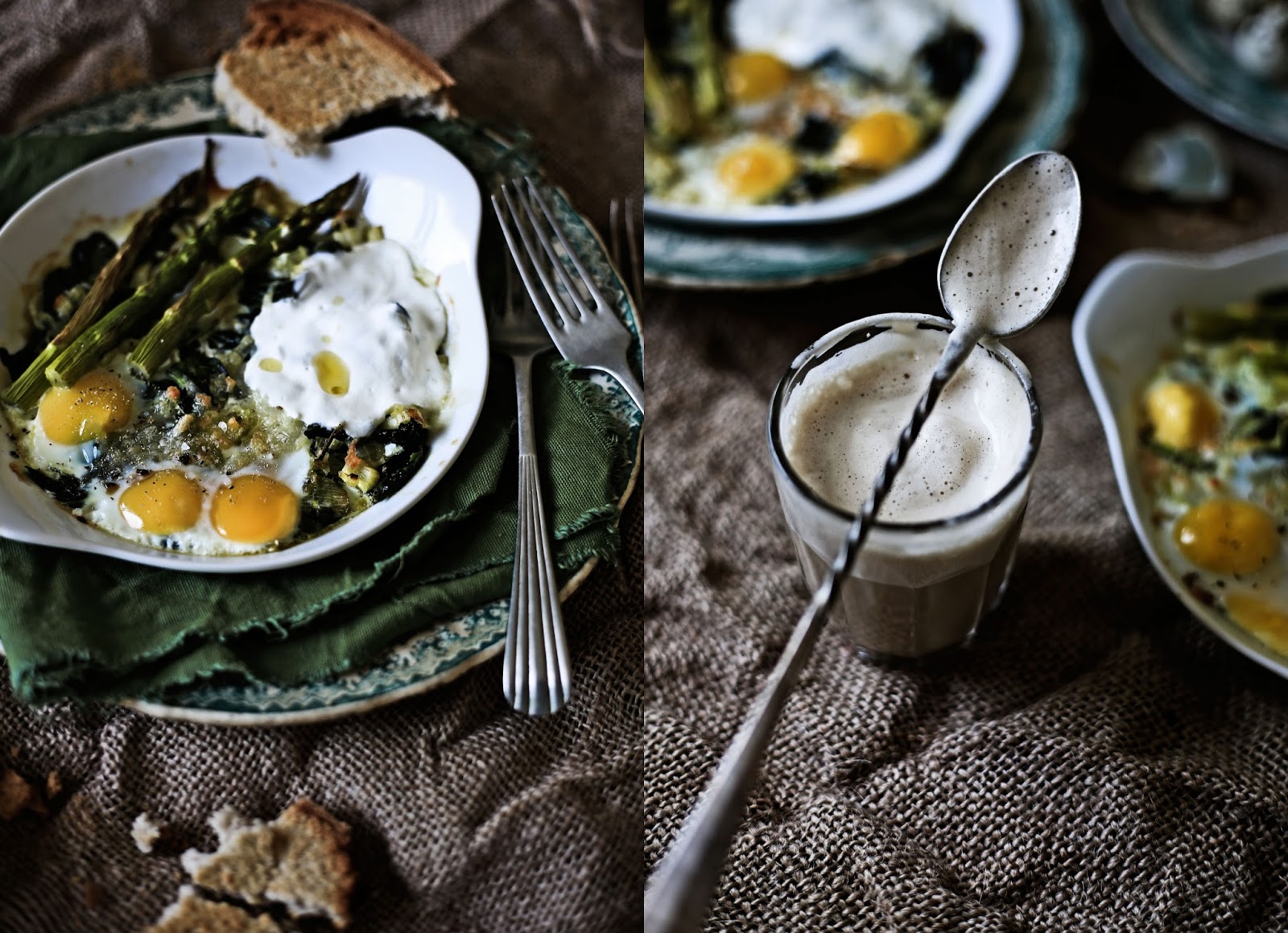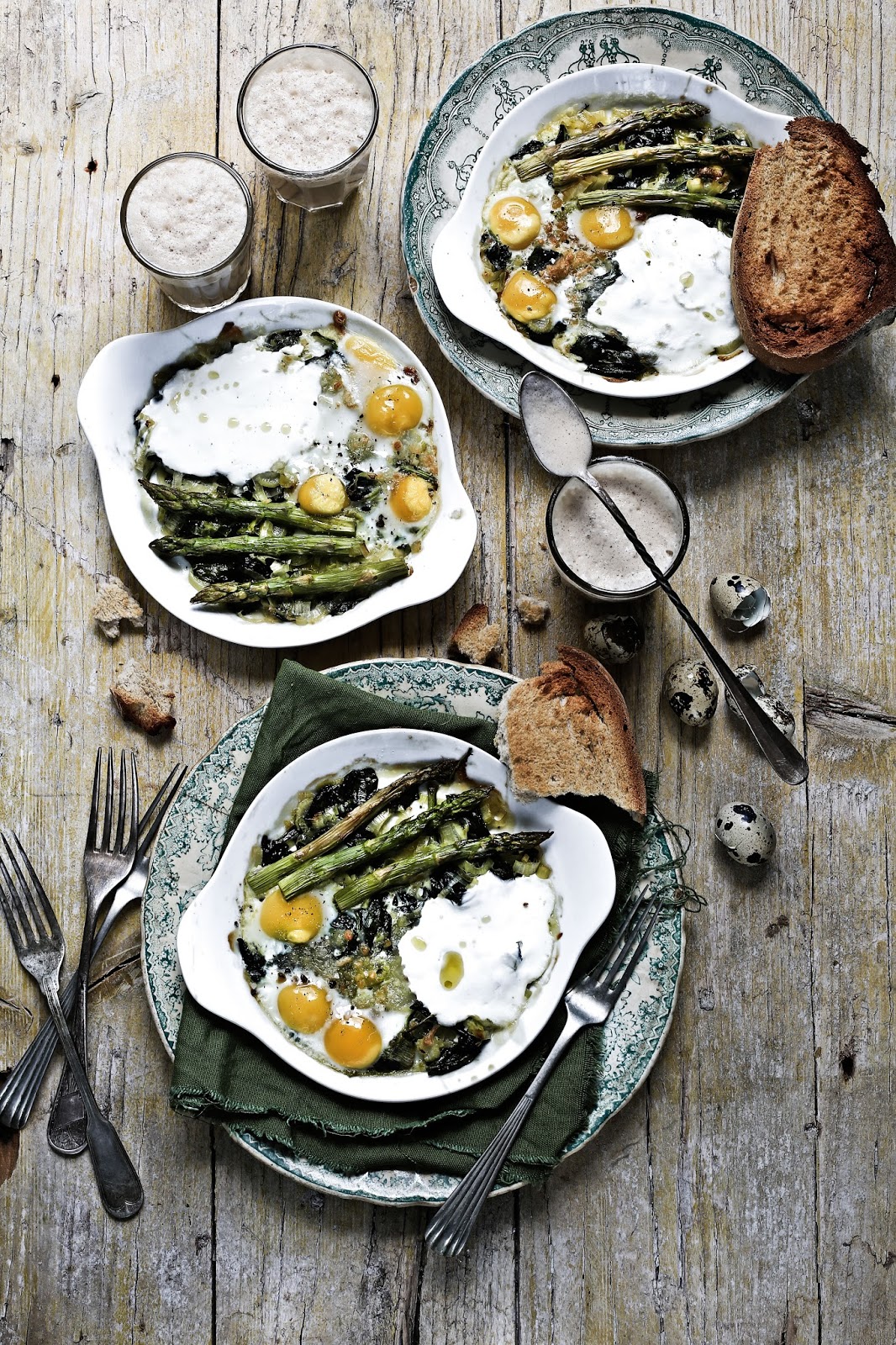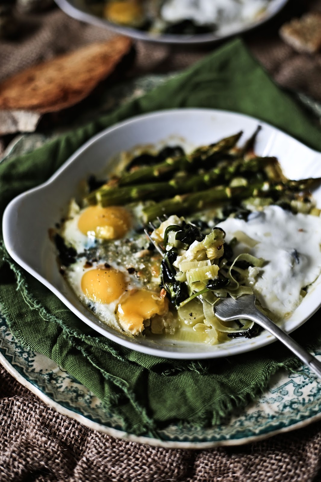 Two weeks ago I went to the Alvão Natural Park for a few days. I went through all the surrounding villages and small towns to gather landscape and antropology photos and I´m still unther the effect of this head and heart dive into one of the most beautiful natural areas of Portugal. I didn´t have the time to edit all the work done yet but Í want to share a bit of it with you on my next post. In the meantime, and who knows, as an inspiration given by these days out of time I cooked these eggs. Layers of leeks and spinach softened by the heat of the olive oil, topped with a bit of dry, shredded mozzarella, the light acidity of the yogurt, milky quail eggs and tender asparagus, that after going into the oven were elevated to a treat like few others.