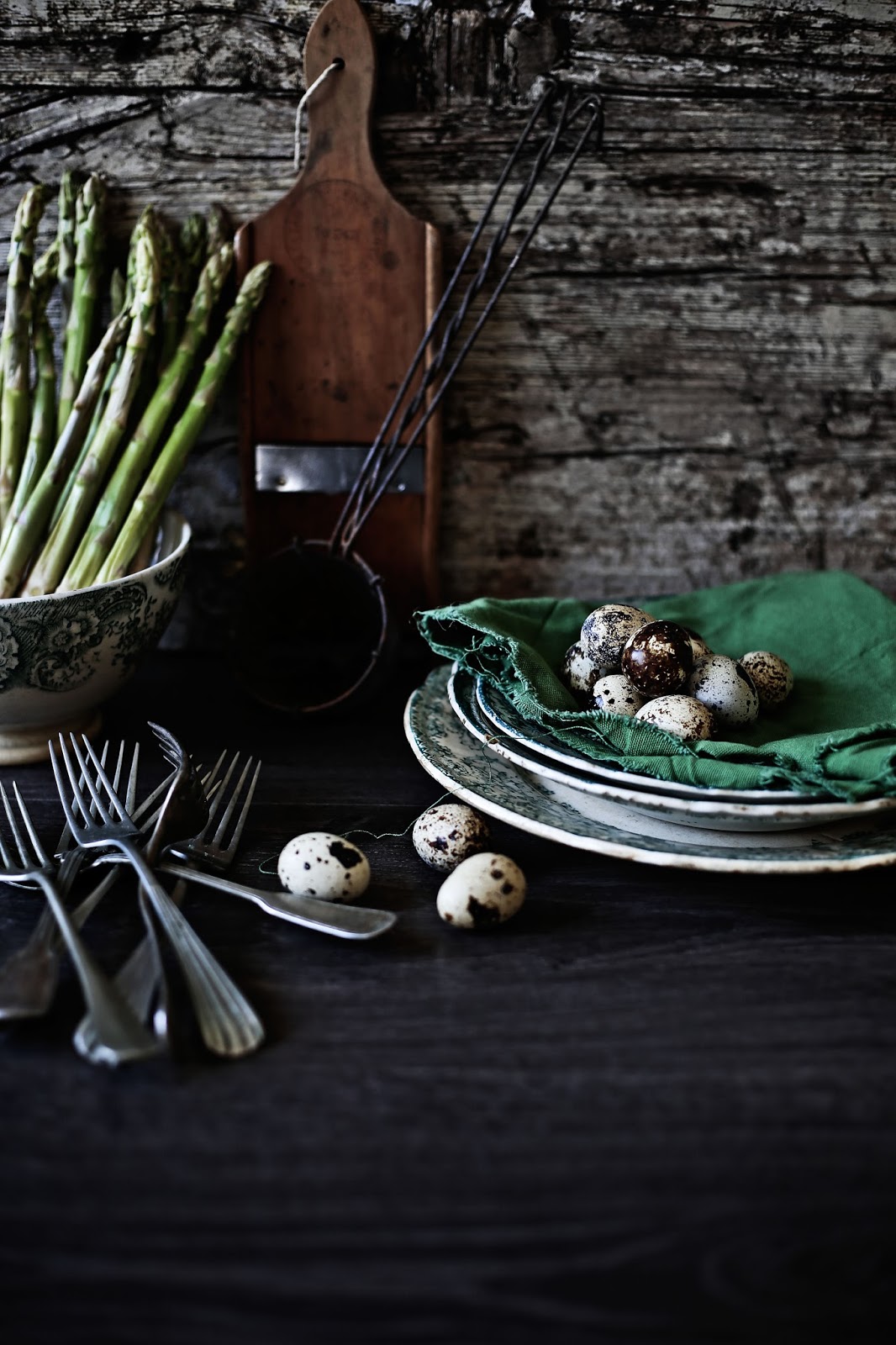 Há duas semanas atrás estive uns dias no Parque Natural do Alvão. Percorri todas as aldeias e vilas das redondezas numa viagem de recolha de imagens de paisagem e antropologia e ainda estou sob o efeito de um mergulho de cabeça e coração numa das zonas naturais mais bonitas de Portugal. Ainda não tive tempo para editar todo o trabalho feito mas na próxima postagem quero partilhar convosco uma parcela desse trabalho. Entretanto, e quem sabe, como inspiração dada por esses dias fora do tempo, cozinhei estes ovos. Camadas de alho francês e espinafres amaciados no calor do azeite, cobertos por um pouco de queijo mozzarella seco ralado, a leveza ácida do iogurte, ovos leitosos de codorniz e espargos tenros, que depois de irem ao forno se elevam a um petisco como poucos.