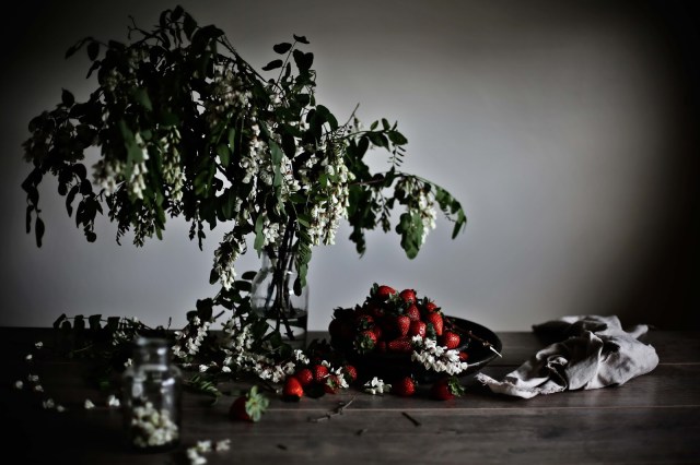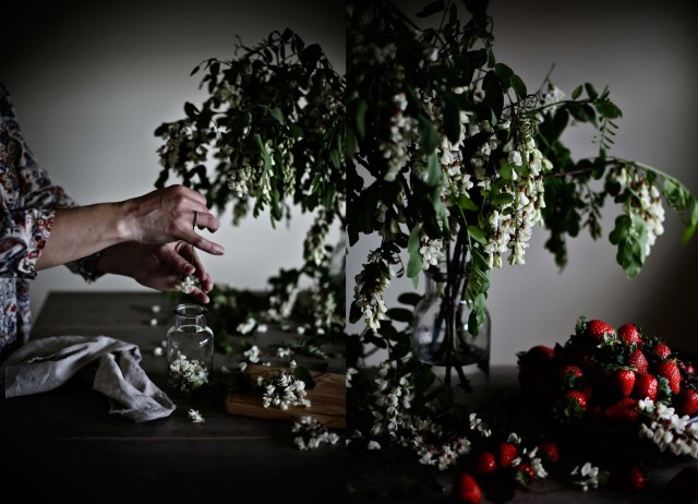 The acacias have a soft, sweet and delicious scent. You only use the flowers and the peduncles; the bark, seeds and roots are toxic. But the flowers… the flowers appeal to sugar, remind sweet things, I want them in cakes, simple, homemade cakes that ask for fresh tea or freshly brewed coffee. Like this one made of a buttery batter, enriched with flowers, with almond and pieces of strawberries that make it extra moist.