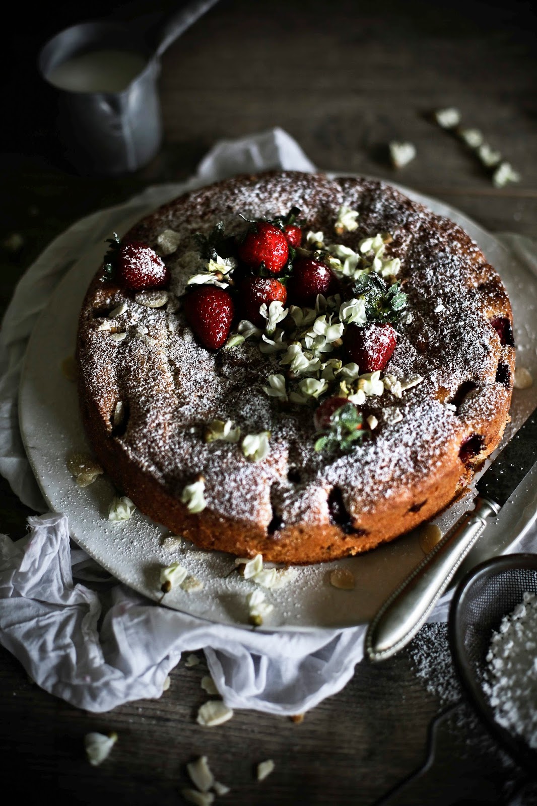 As acácias têm um perfume suave, doce e delicioso. Só se usam as flores e os pedunculos; a casca , as sementes e a raíz são tóxicas. Mas as flores… as flores apelam ao açúcar, lembram coisas doces, apetecem-me em bolos, daqueles simples, caseiros que pedem chávenas de chá ou de café acabados de fazer. Como este,  feito de uma massa amanteigada, enriquecido com flores, com amêndoa e pedaços de morango que o tornam extra húmido.