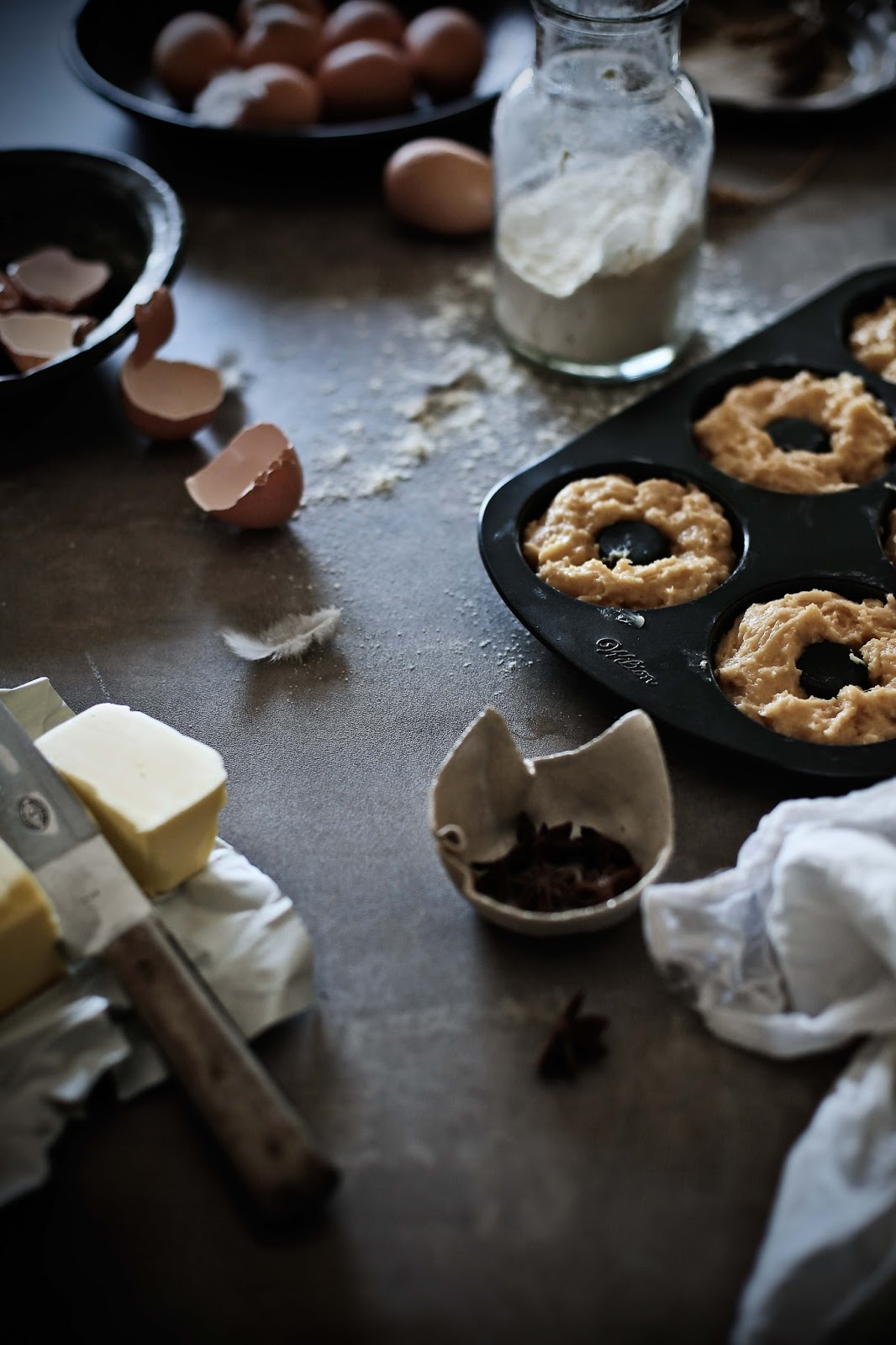 *Butter 2 donut pans or 12 savarin moulds and set aside.