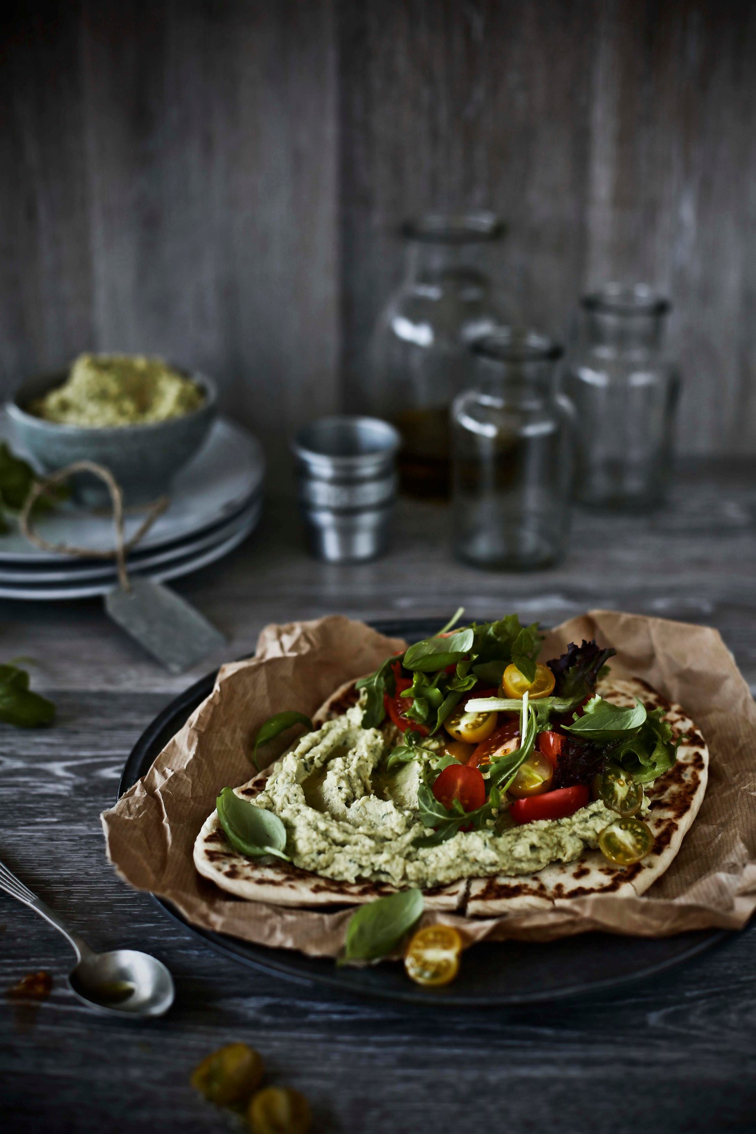 - Barre uma boa quantidade de hummus em cada naan, junte tomates cortados e folhas verdes, regue com azeite e sirva como uma sandwich.