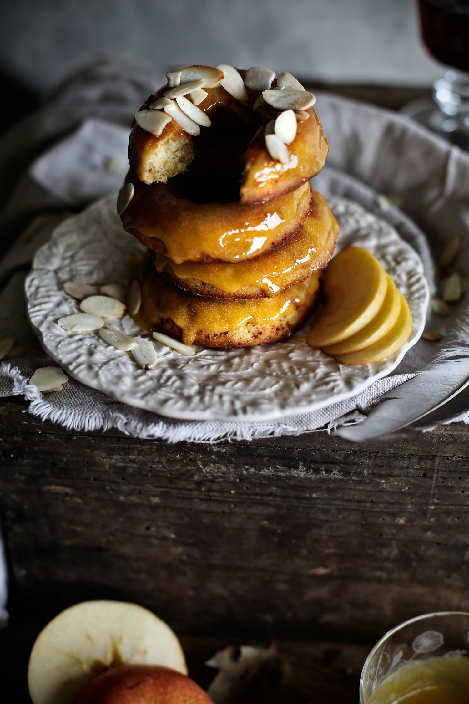 Aqui estamos em terreno virtuoso. Estes donuts de maça e vermute não se fritam, em vez disso cozem no forno. São rápidos de fazer e de comer ainda mais. A verdade é que nem tão pouco são autênticos já que a massa não é levedada e sim de muffins. No entanto saem-se muito bem ao representá-los. São deliciosamente macios. A maça embebida em vermute dá-lhes um toque de sabor especial e o doce de ovos é a cobertura perfeita.