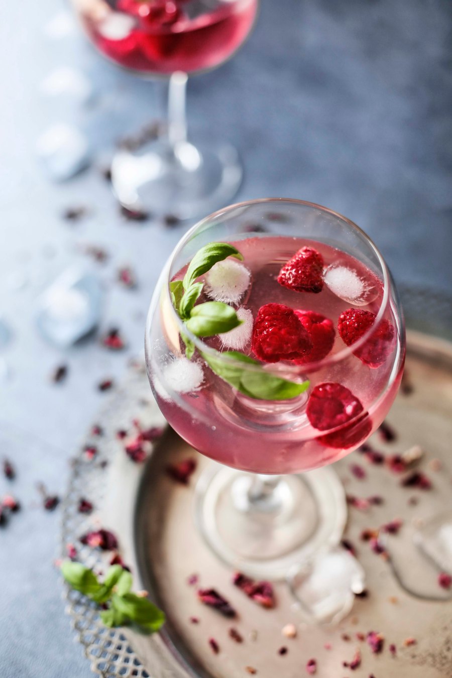 - For each cocktail add 2 parts of gin, 1 part of rose syrup, the raspberries and basil leaves.
