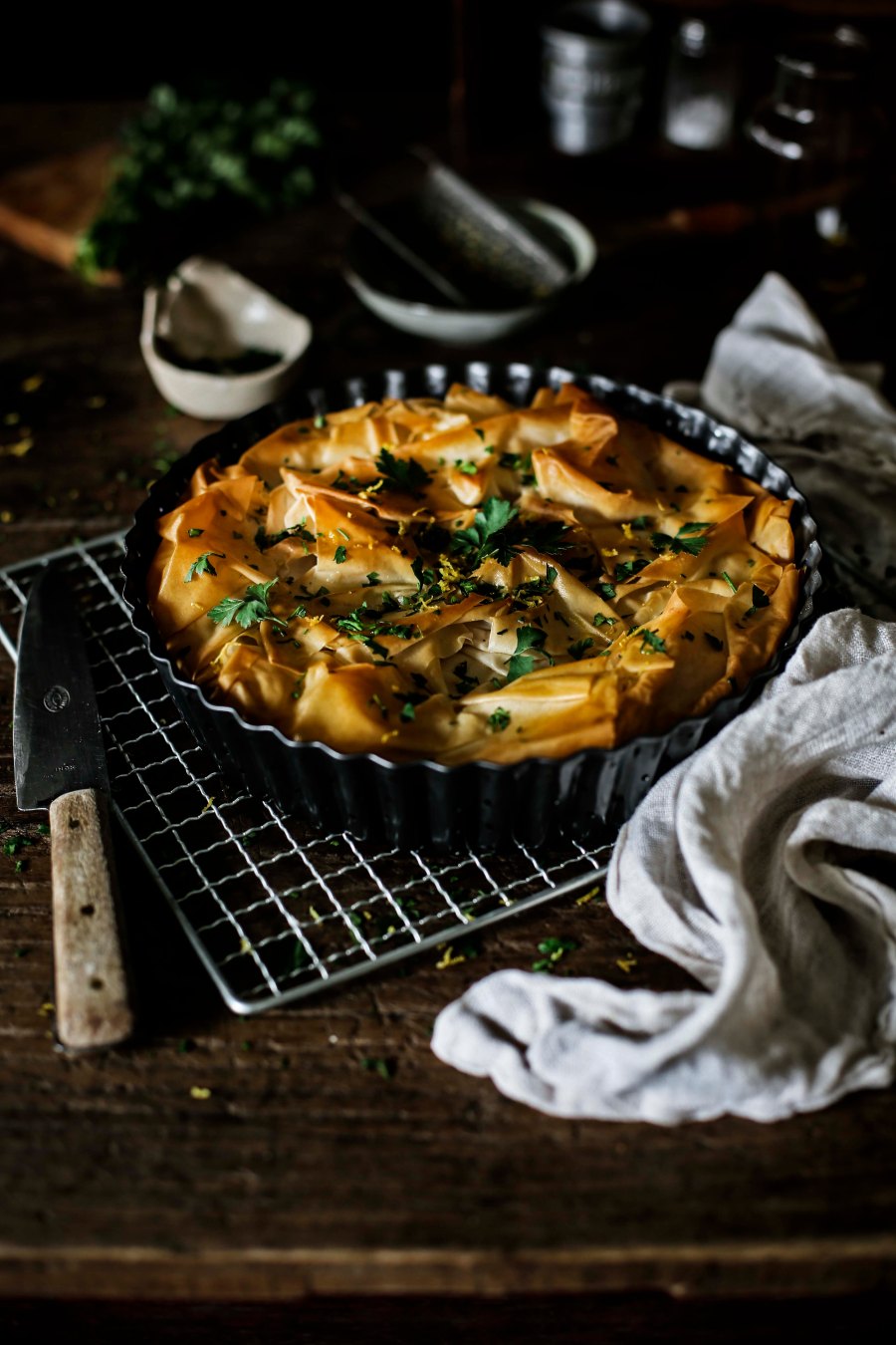 - Cover the stuffing by pulling the tips of the pastry sheets over it and cover with the last 2 pastry sheets, crumpling them. Brush with melted butter, cover with tin foil and bake for 30 minutes. Remove the tin foil and let the tart gain a golden brown color.