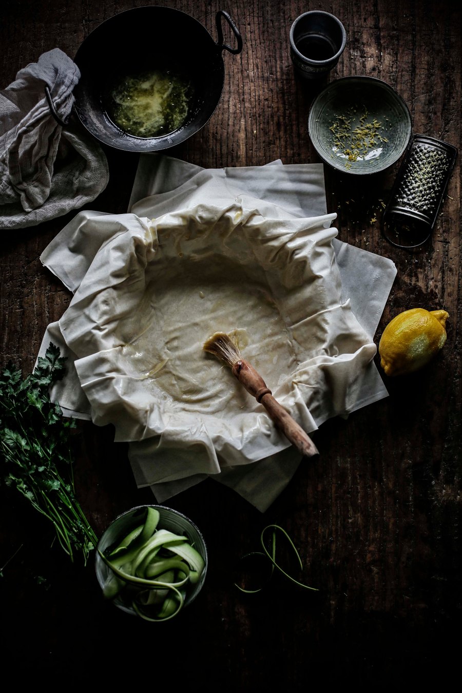 - Forre uma tarteira alta com 4 folhas de massa filo, uma a uma, pincelando cada uma com manteiga derretida antes de colocar a seguinte em cima.