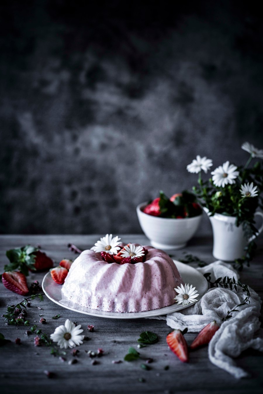 - Rinse a pudding, or bundt cake pan under cold water and shakke off the excess. Pour the strawberry mixture into the wet pan.
