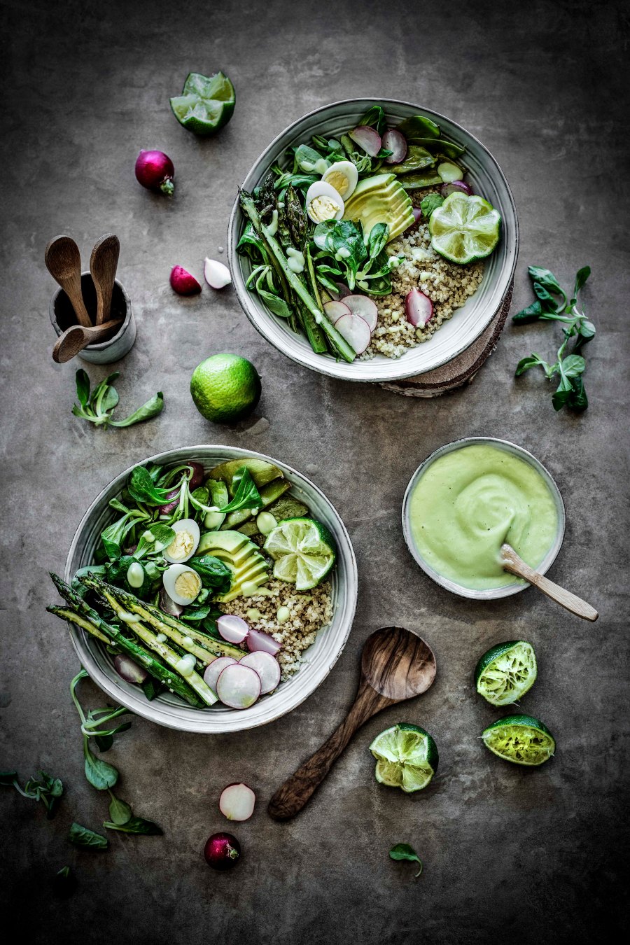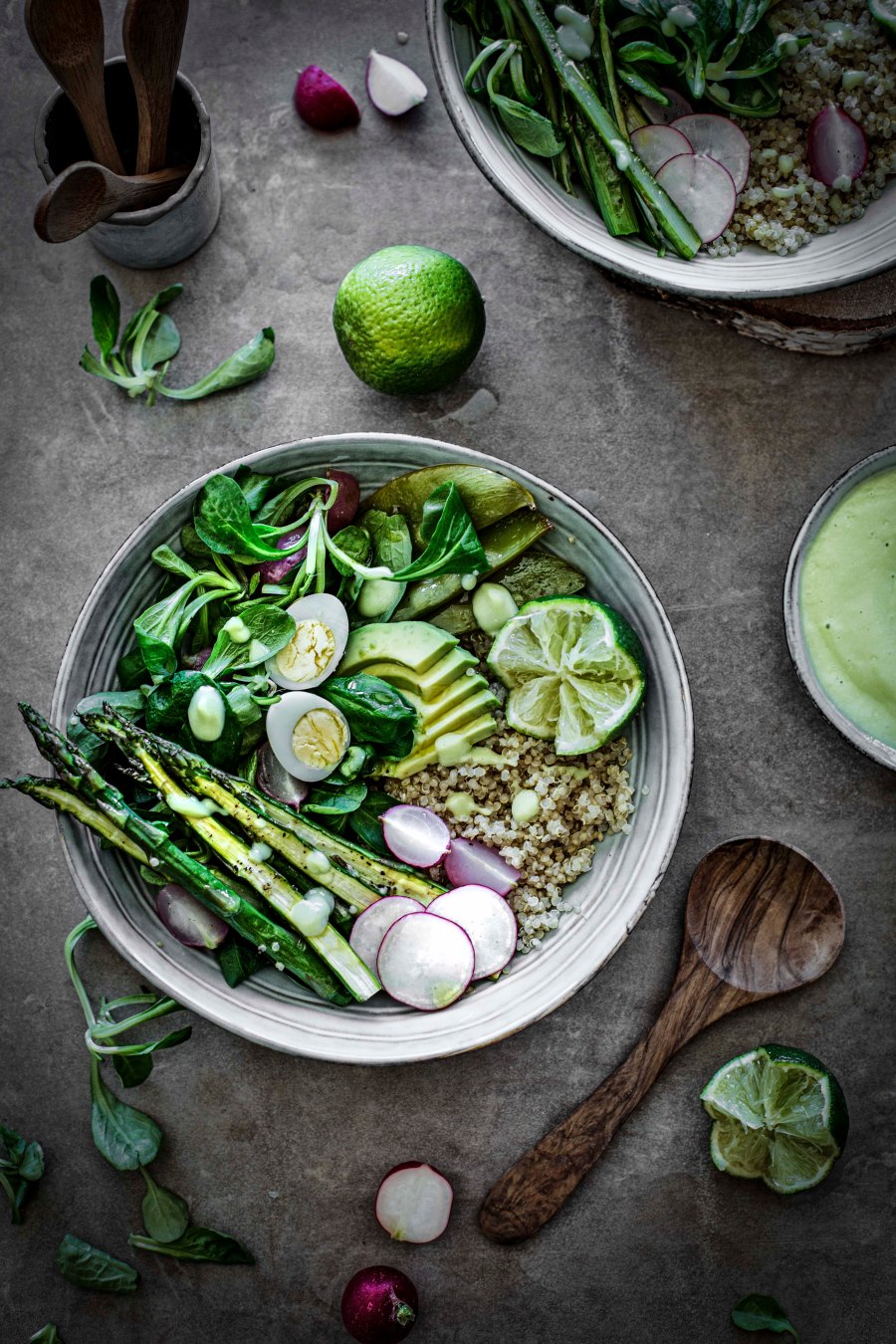 Asparagus, radishes, snow peas, mache. Fennel and peas shoul also be here, but for these bowls these are a perfect match.