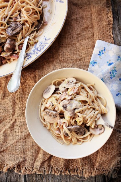 Linguini com cogumelos, alho francês e bacon # Linguini with mushrooms, leeks and bacon