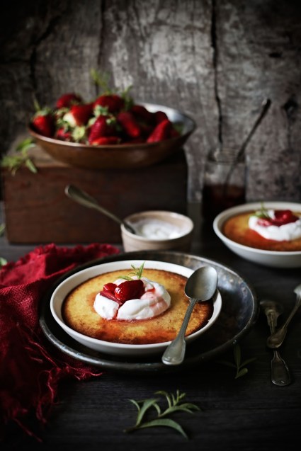 Pudim de laranja e coco com compota de morango e limonete # Orange and coconut pudding with strawberry, verbena compote
