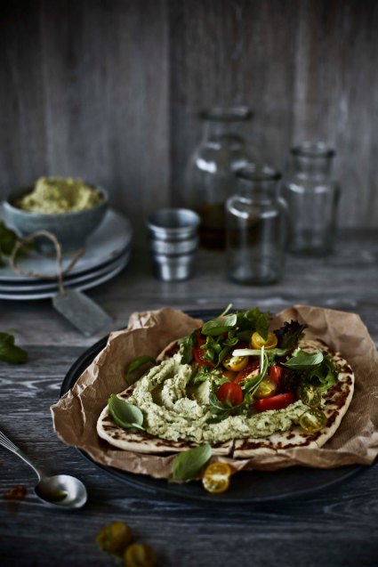 Naan com hummus de manjericão, tomates e folhas verdes # Naan with basil hummus, tomatoes and green leaves